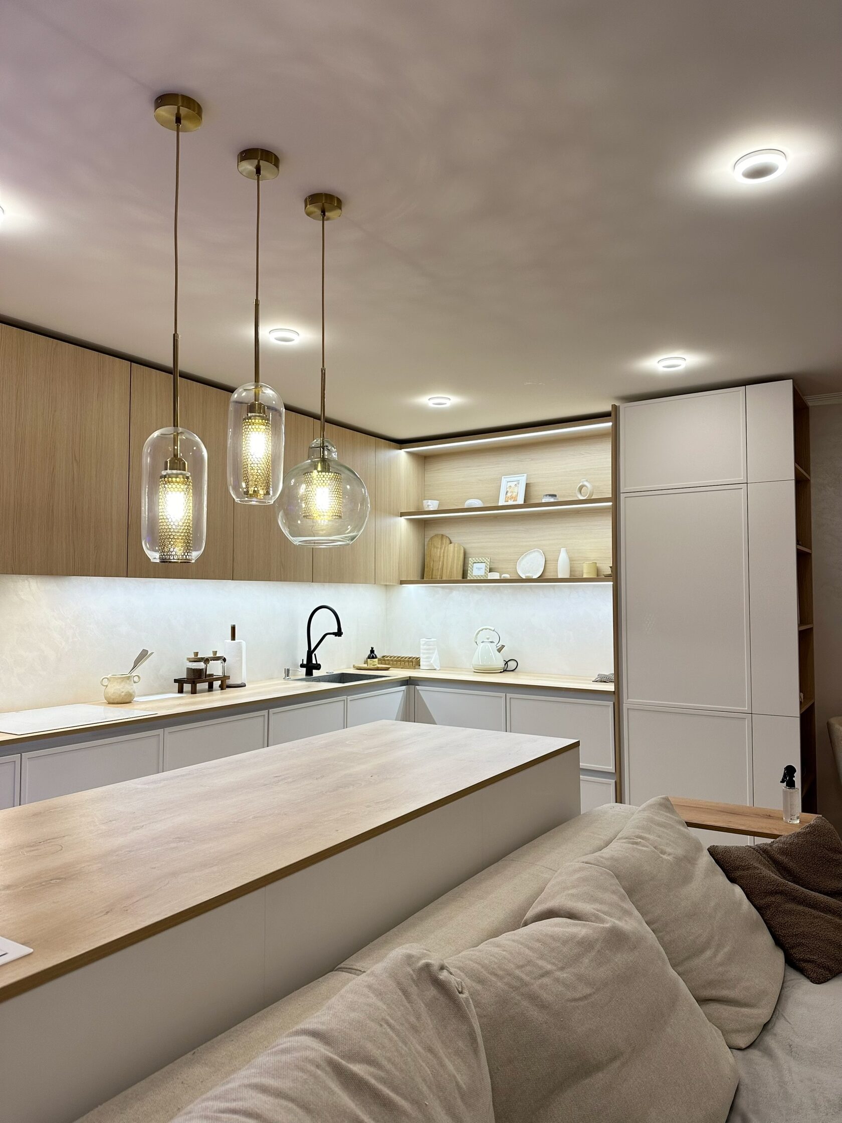 Линейная LED-подсветка рабочей зоны + акцент над островом.
